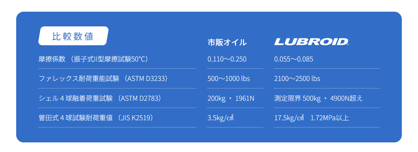 ルブロイドとは、独創的な潤滑(lubrication)技術の高機能体(roid)を意味づけた合成熟語です。従来の発想では不可能とされたハロゲンフリーを可能とし、かつ超極圧性能と低摩擦係数(0.055 ~ 0.085)を実現した「超極圧潤滑剤」です。