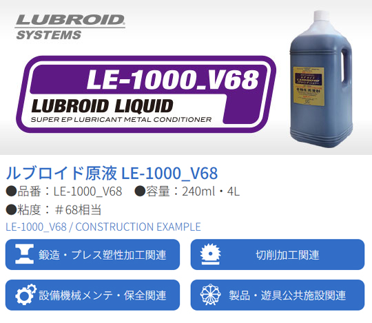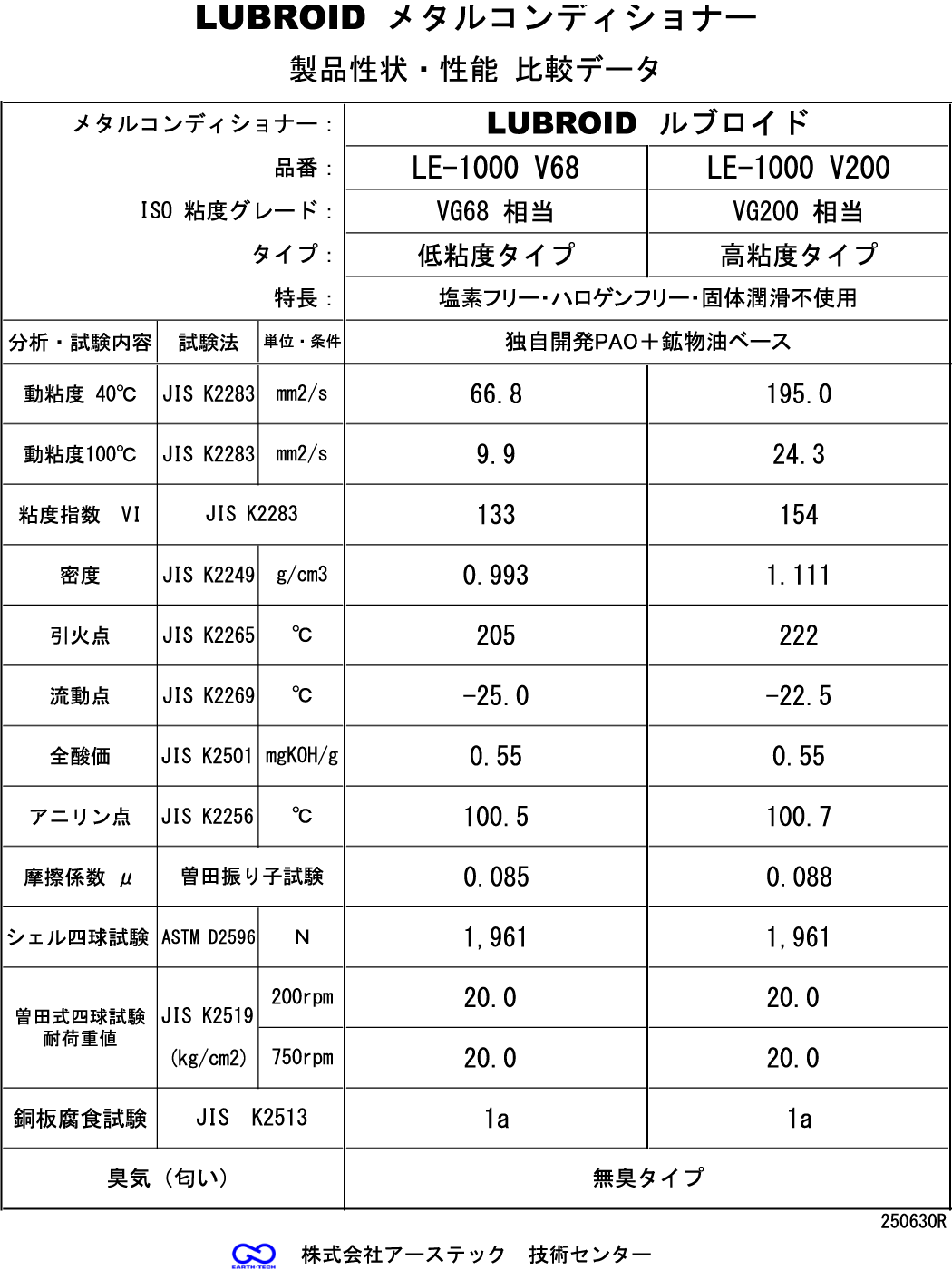 当社ルブロイド原液タイプ LE-1000 V200 と LE-1000 V68 とのスペック比較値、特徴を示した表です。鍛造・プレス塑性加工関連のテーマにおいて、使用法(用途)、使用効果や導入効果事例については こちら をご覧ください。