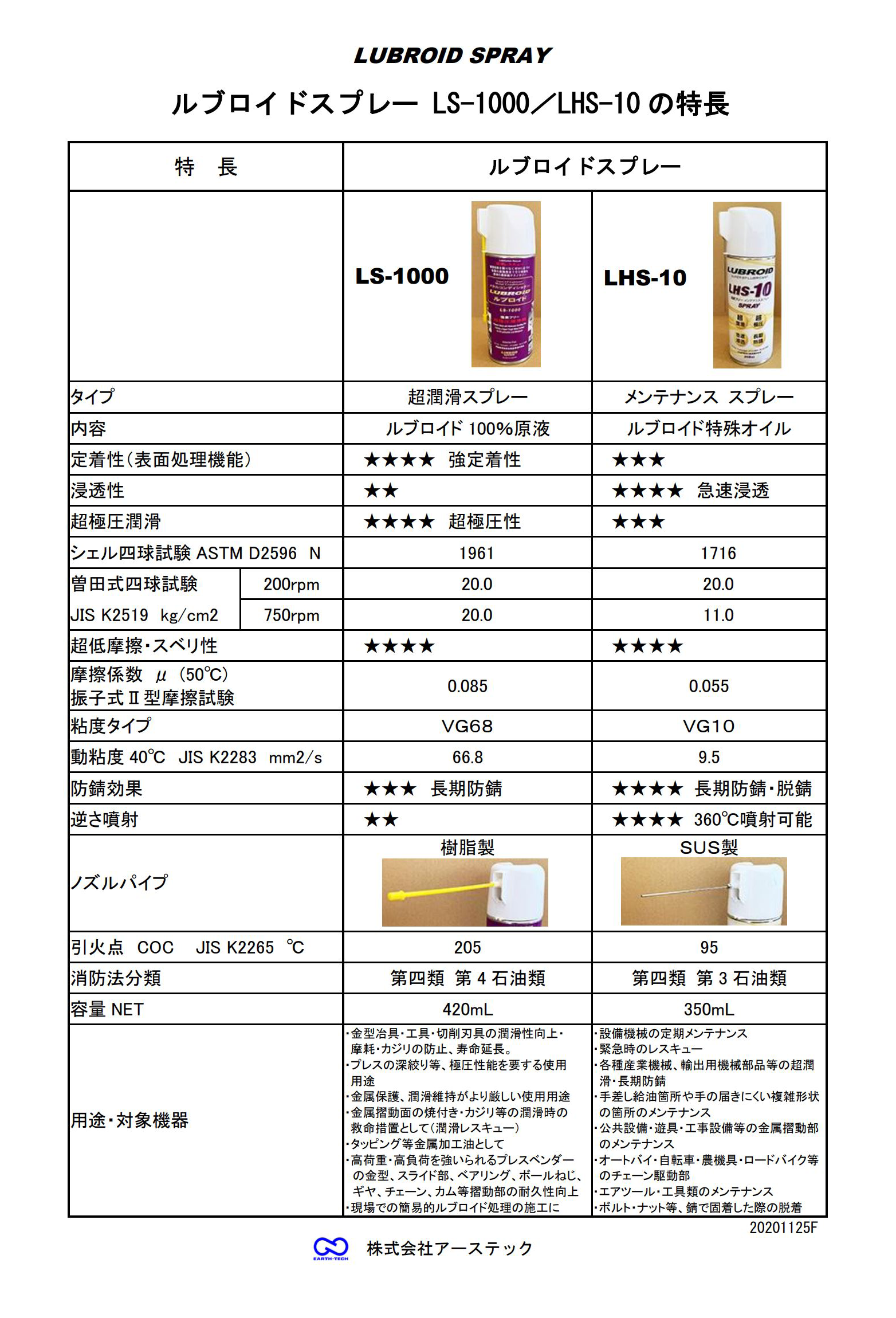 当社ルブロイドスプレータイプ LS-1000 と LHS-10 とのスペック比較値、特徴を示した表です。色々な用途・対象機器に適した製品をお選びいただけます。