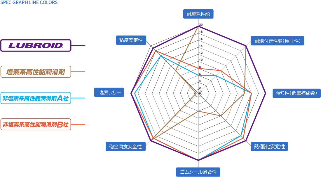 「ルブロイド」は塩素フリー・ハロゲンフリー且つ固体潤滑剤を含まない超極圧潤滑剤です。下記グラフで示したように金属摺動部の耐摩耗性能を始め、焼付き防止性能、低摩擦のすべり性、熱酸化劣化の防止、ゴム・樹脂シールやパッキン類への適合性など、従来の潤滑剤と比較すると、「ルブロイド」は多くの機能において圧倒的に高い性能を有しています。