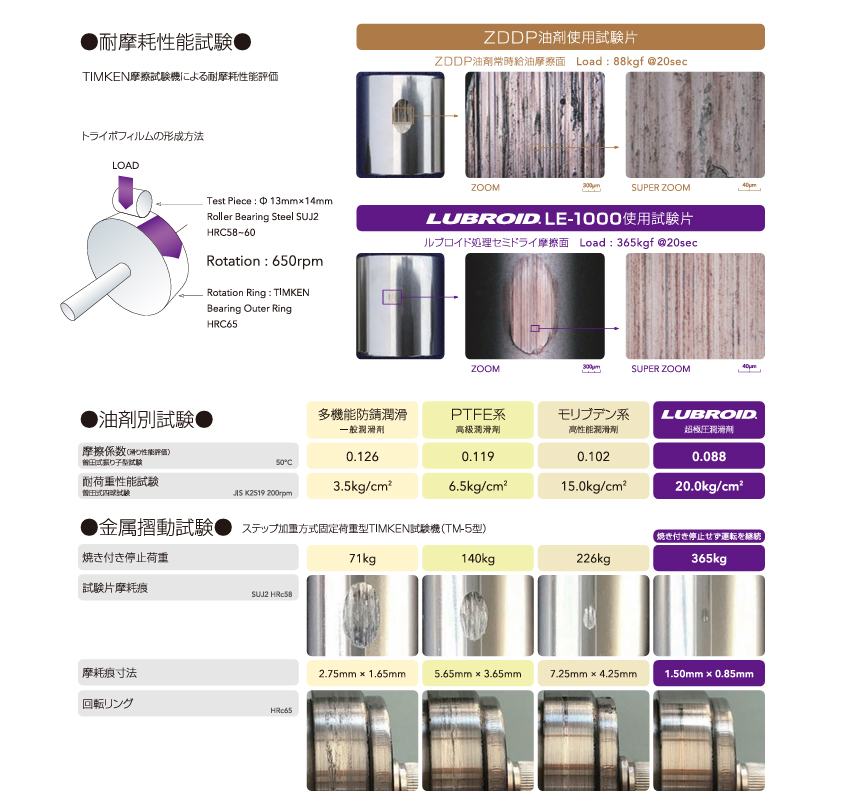 ルブロイドのトライボフィルム(分子結合潤滑被膜)は、オイル&グリースのウエット・セミドライ・ドライ・サーフェスな どのさまざまな条件で「超潤滑」と断言できる「摩擦低減機構」と「耐摩耗性能」を発現します。